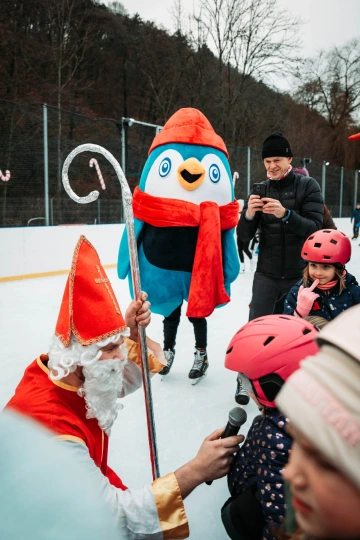 Na kluziště dorazil také Mikuláš se svými pomocníky, kteří rozdávali úsměvy i drobné odměny malým bruslařům. Nechybělo teplé občerstvení, světelné efekty a spousta zábavy, která vytvořila krásnou předvánoční náladu.